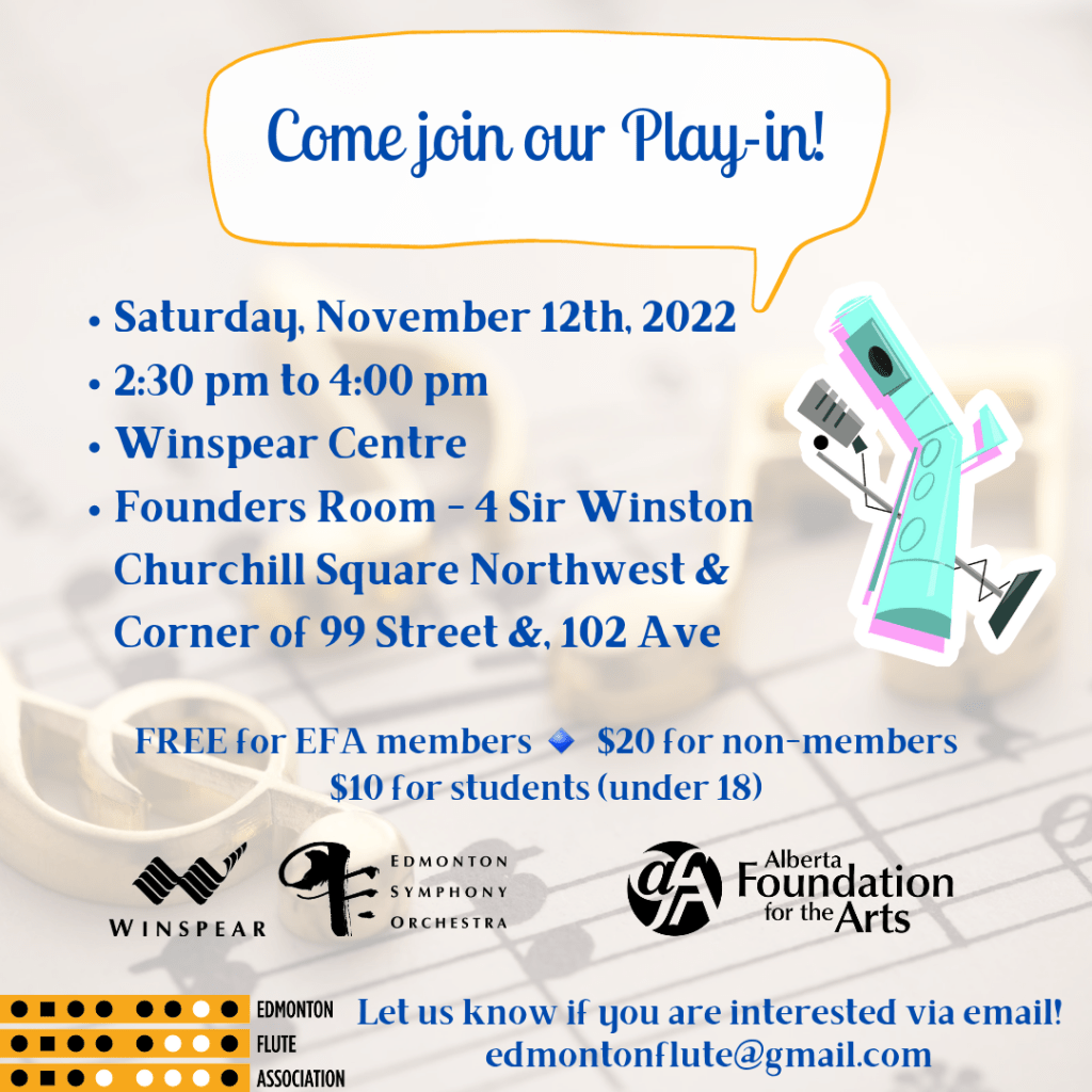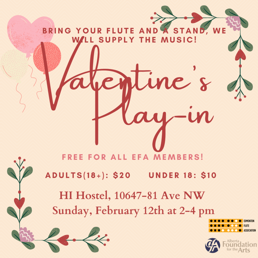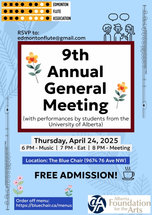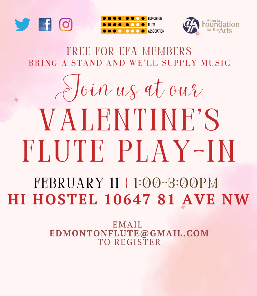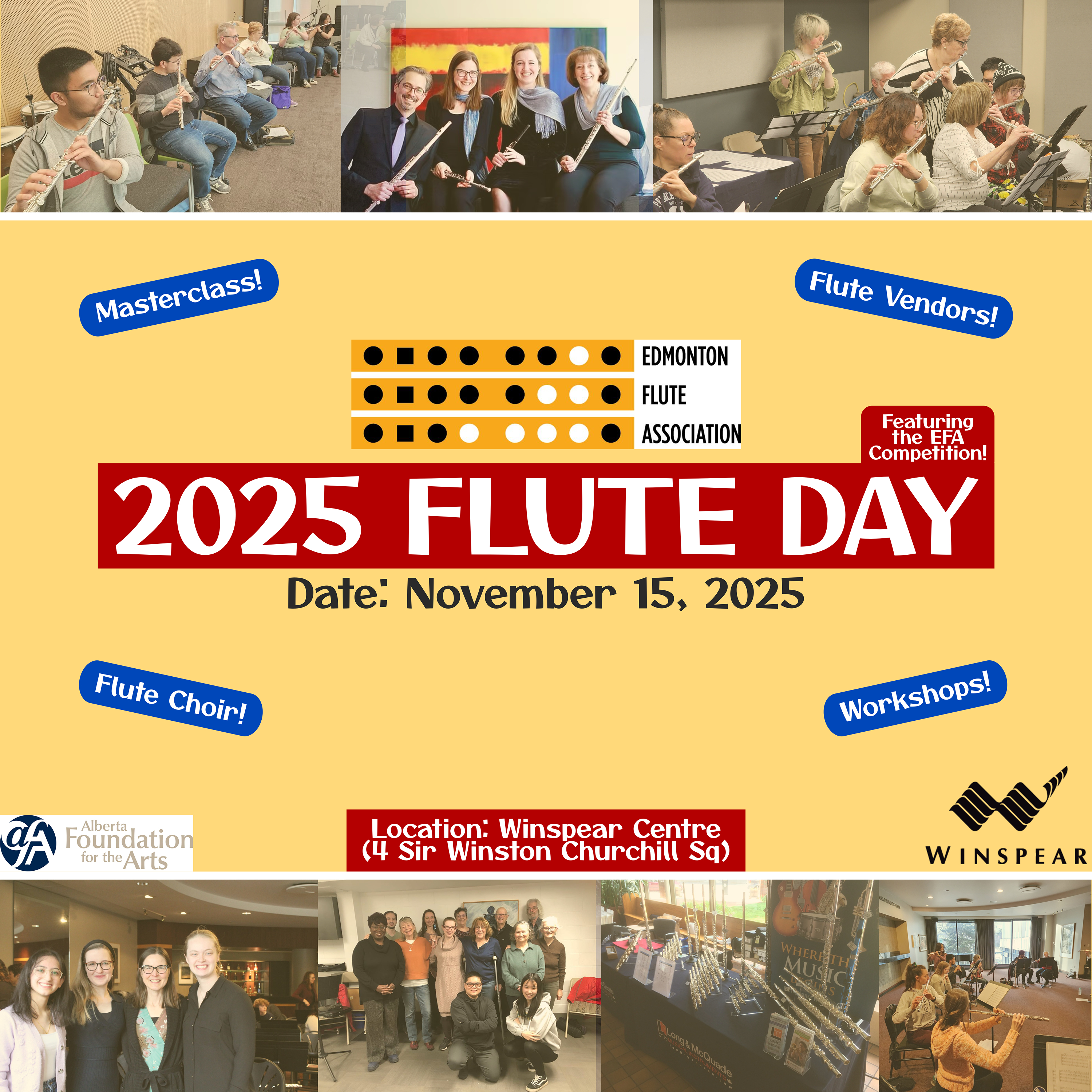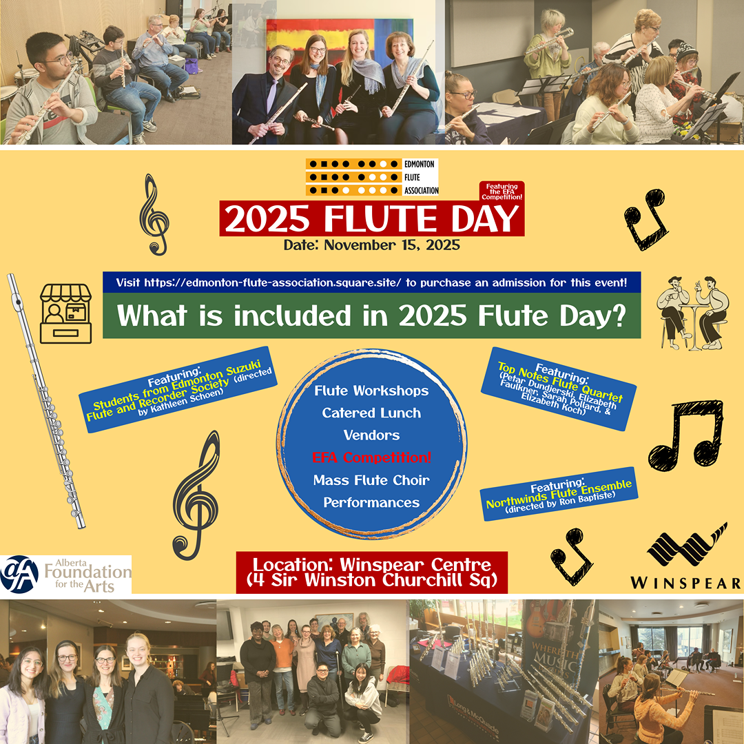 We have lots of events in the works, such as play-ins, workshops, Flute Slams and much more! Stay up to date with us on social media! Follow @edmontonflute